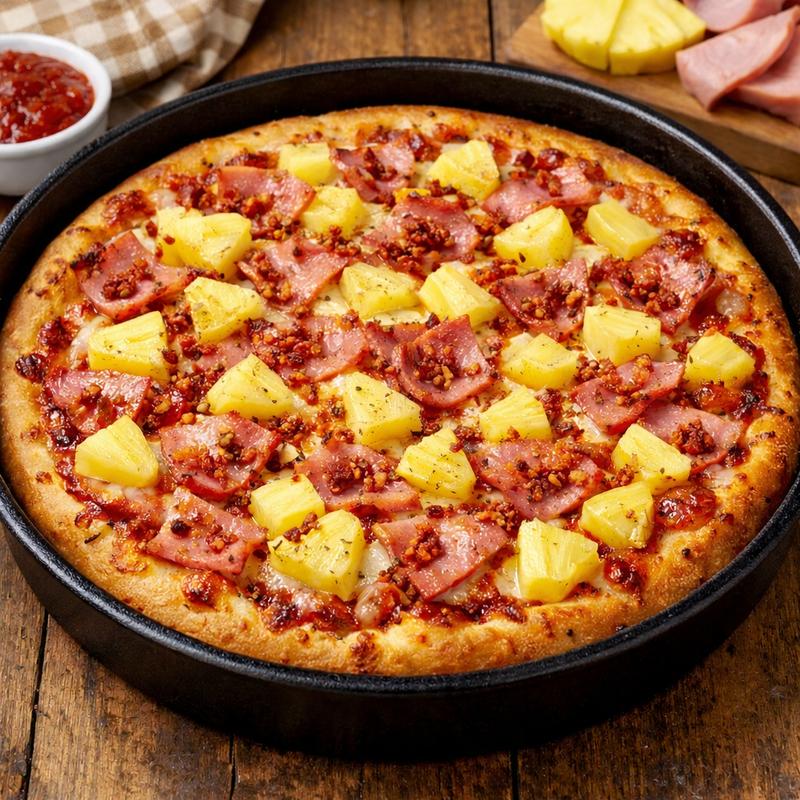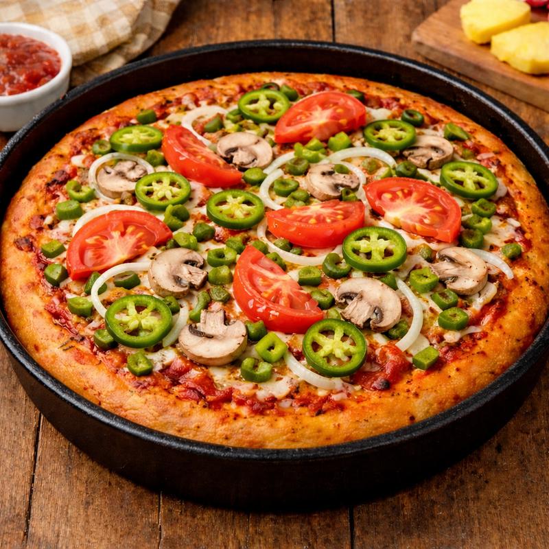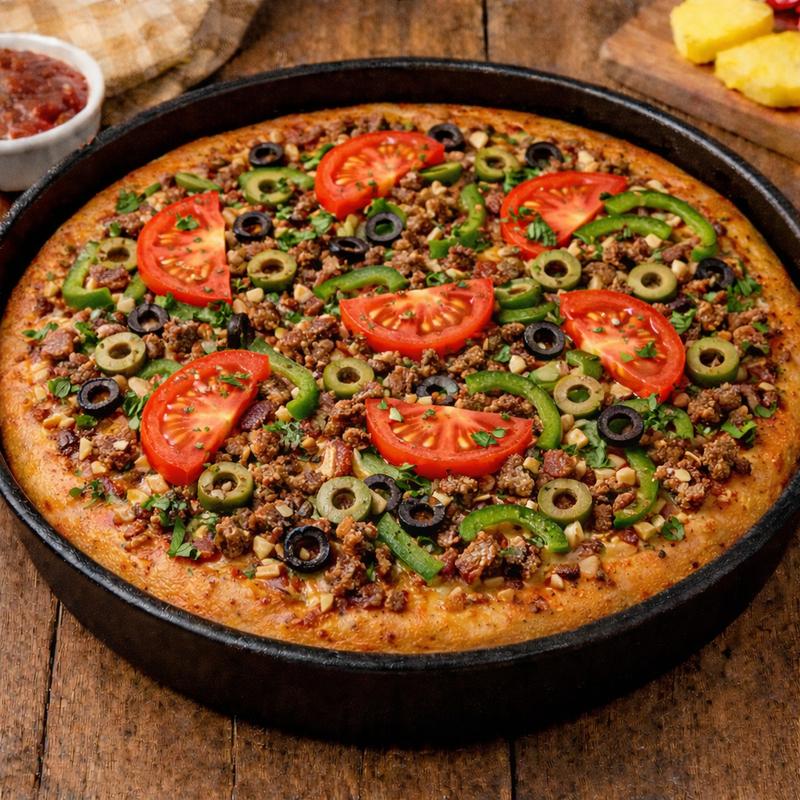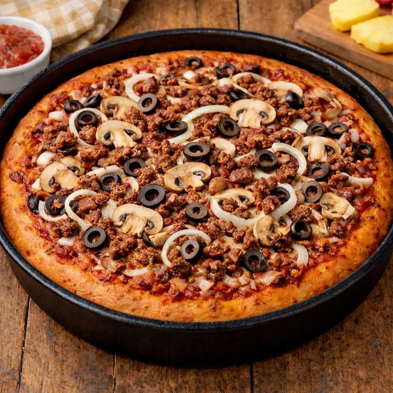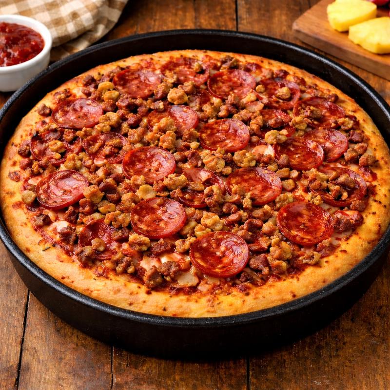Small (11'') - $19.99 | Medium (13'') - $21.99 | Large (15'') - $25.99 || Beef, sausage, pepperoni, mushrooms, ham, onions, black olives, green peppers, bacon, anchovies, and jalapeno peppers.