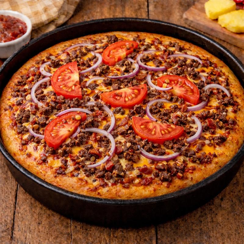 Beef, red onions, tomato, bacon, and mozzarella cheese.