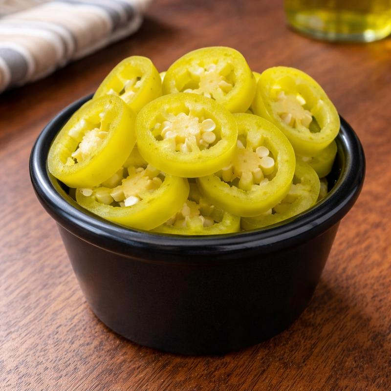 Sliced banana peppers offering a mild, tangy, and slightly sweet flavor.